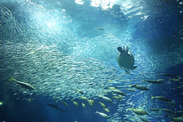 水量1,300tを誇る「出会いの海の大水槽」では、人気のウミガメなどをはじめ80種20,000匹の生き物を