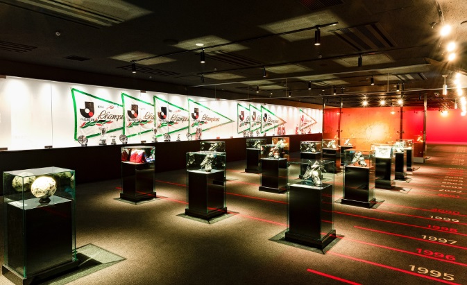 歴代の選手名簿やトロフィー、優勝ペナントが飾られており、Jリーグ屈指の名門チームであることが伺えます。